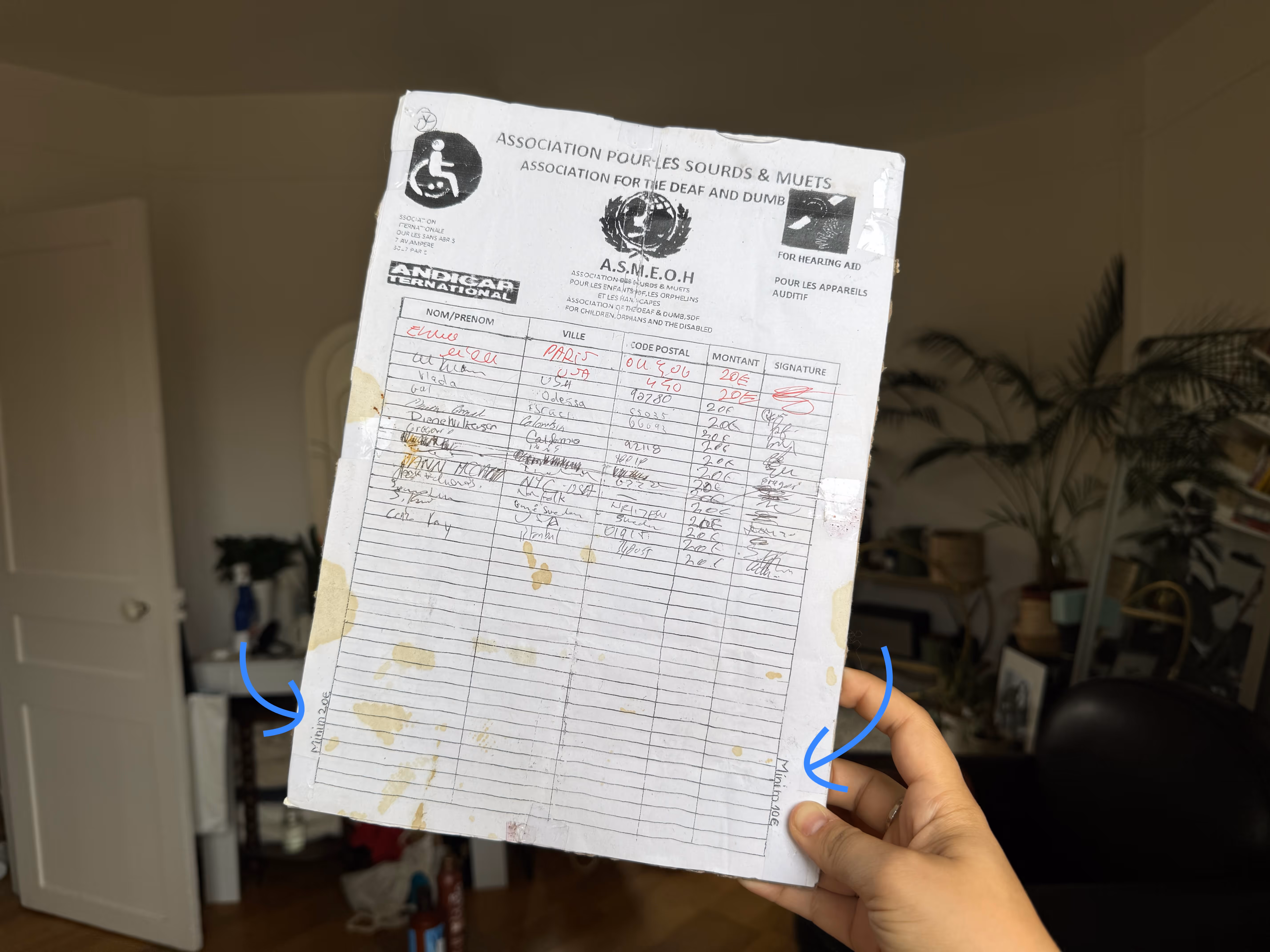 是的,我们在巴黎的垃圾箱里发现了一份假的请愿书,并保留了它来告诉你它是如何运作的。你会注意该慈善机构的名字,与现实组织结构的名字相似,但略有变化。但我发现请愿书两边的两个价格最有趣。基本上,当你标签字幕时,他们会用手把它藏起来,然后向你展示他们想让你的付款价格(取而代之的是他们估计你来哪个)。